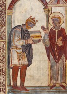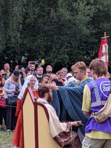 This is an earlier image of the event, featuring Archbishop Anthelm – depicted above by Regia Anglorum’s Classical Officer, Wilfred Somogyi – exhorting the king to be “an hindrance to his enemies”and to bring amongst other benefits “reproof to the exalted, comfort to the needy” and “teaching to the rich…” These latter two might be employed today as the current monarch tackles his feckless brother….
