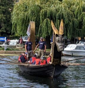 September brought the return of King Athelstan this time by water, with a flotilla of some seventy boats celebrating Kingston’s River Cultures Festival, aboard the” Sae Wylfing”, a half-length reproduction of a famous boat found at the Sutton Hoo Saxon burial site in Suffolk.